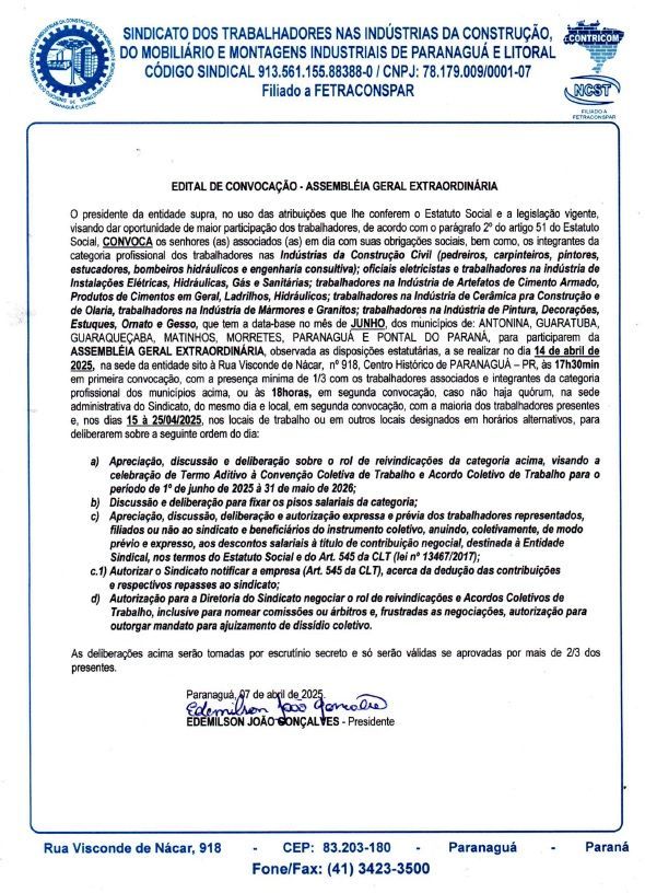 Na última sexta-feira os TRABALHADORES da Base Sindical do SINTRACON PARANAGUÁ reunidos em ASSEMBLÉIA devidamente convocada e divulgada APROVARAM por unanimidade as proposições apresentadas, debatidas e deliberadas pelo SINDICATO e o conjunto das Categorias Reunidas.