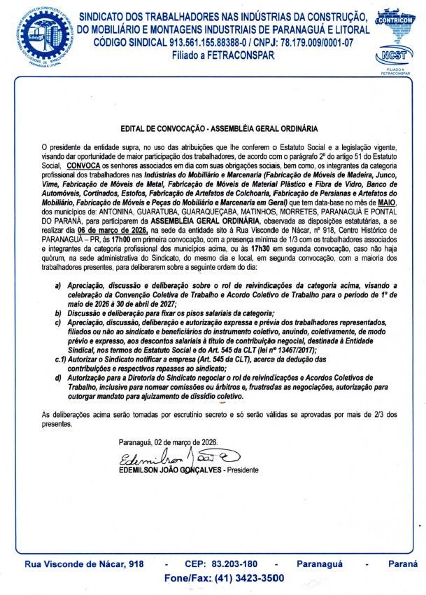 Convocamos todos os Companheiros à participação em nossa ASSEMBLEIA GERAL, na próxima SEGUNDA FEIRA, na sede do SINDICATO, às 17:30h em Primeira Convocação e às 18:00h em Segunda Convocação.